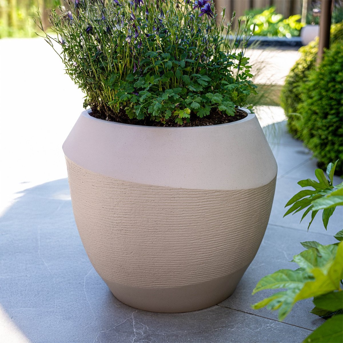 Crafted from fiberglass reinforced with stone powder, this planter delivers durability and weather resistance while maintaining a manageable weight. The natural Sand tone works beautifully with greenery and outdoor spaces, especially patios, gardens, and lawn settings.