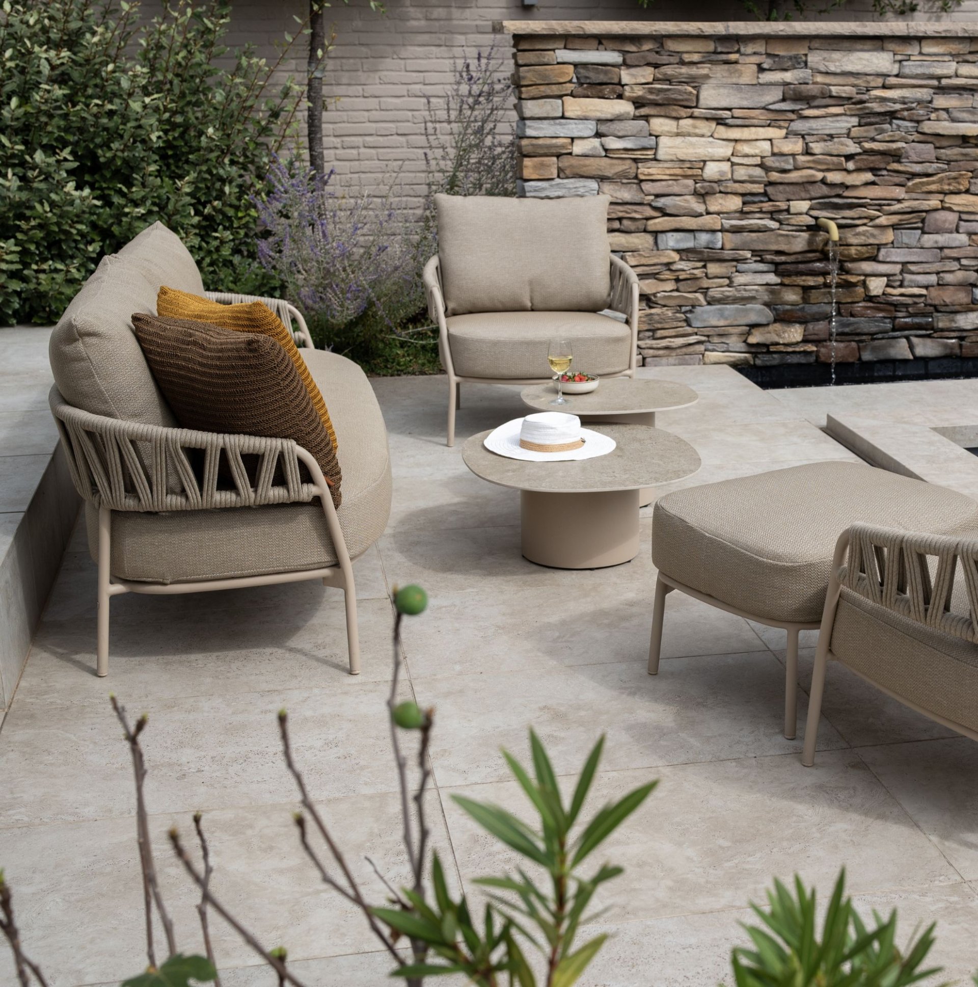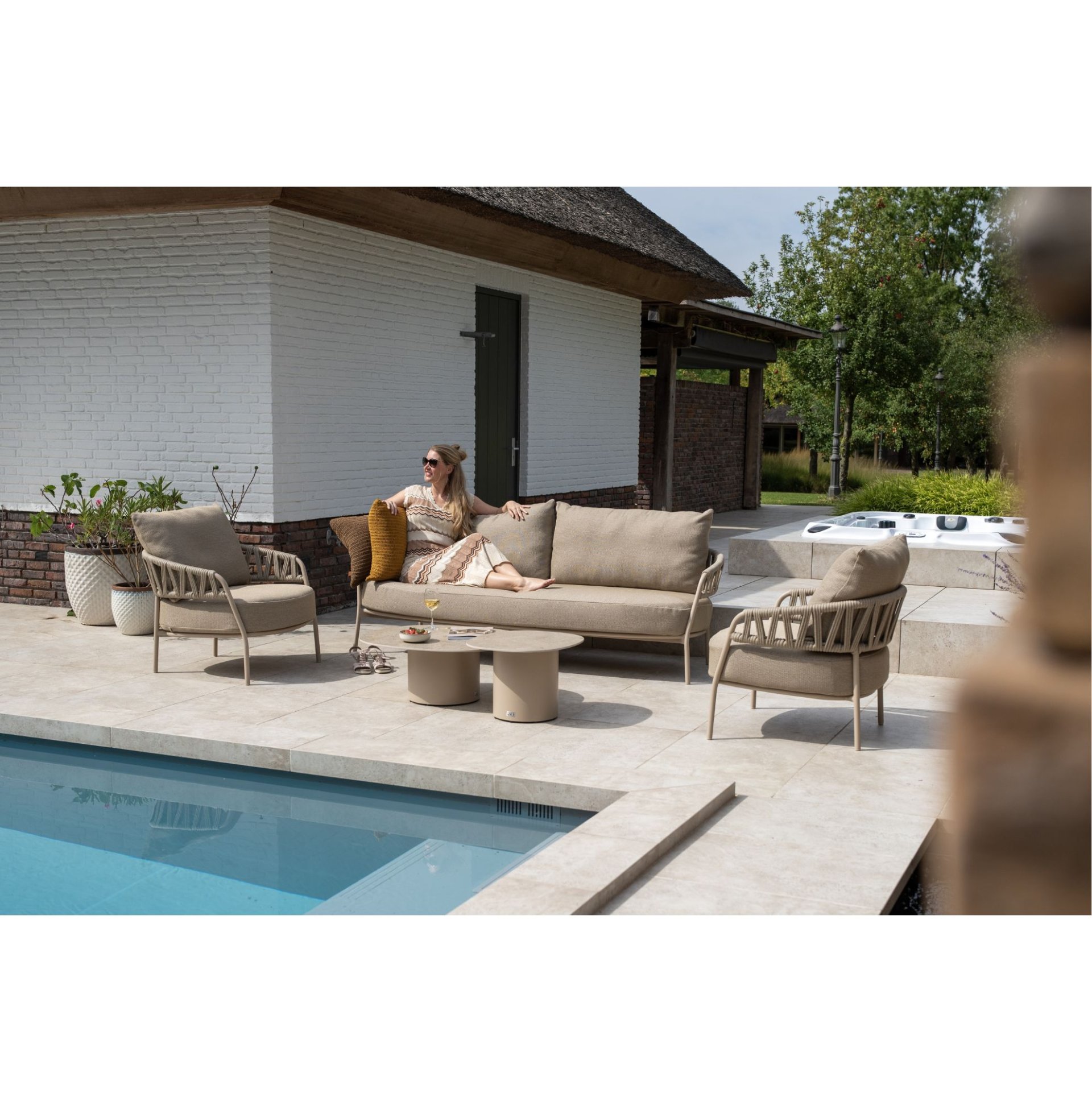 Relax in style with Calma. The round shapes and finely woven backrests create a luxurious look, while the thick cushions elevate comfort to the next level. With Calma you can enjoy the outdoors for years to come.