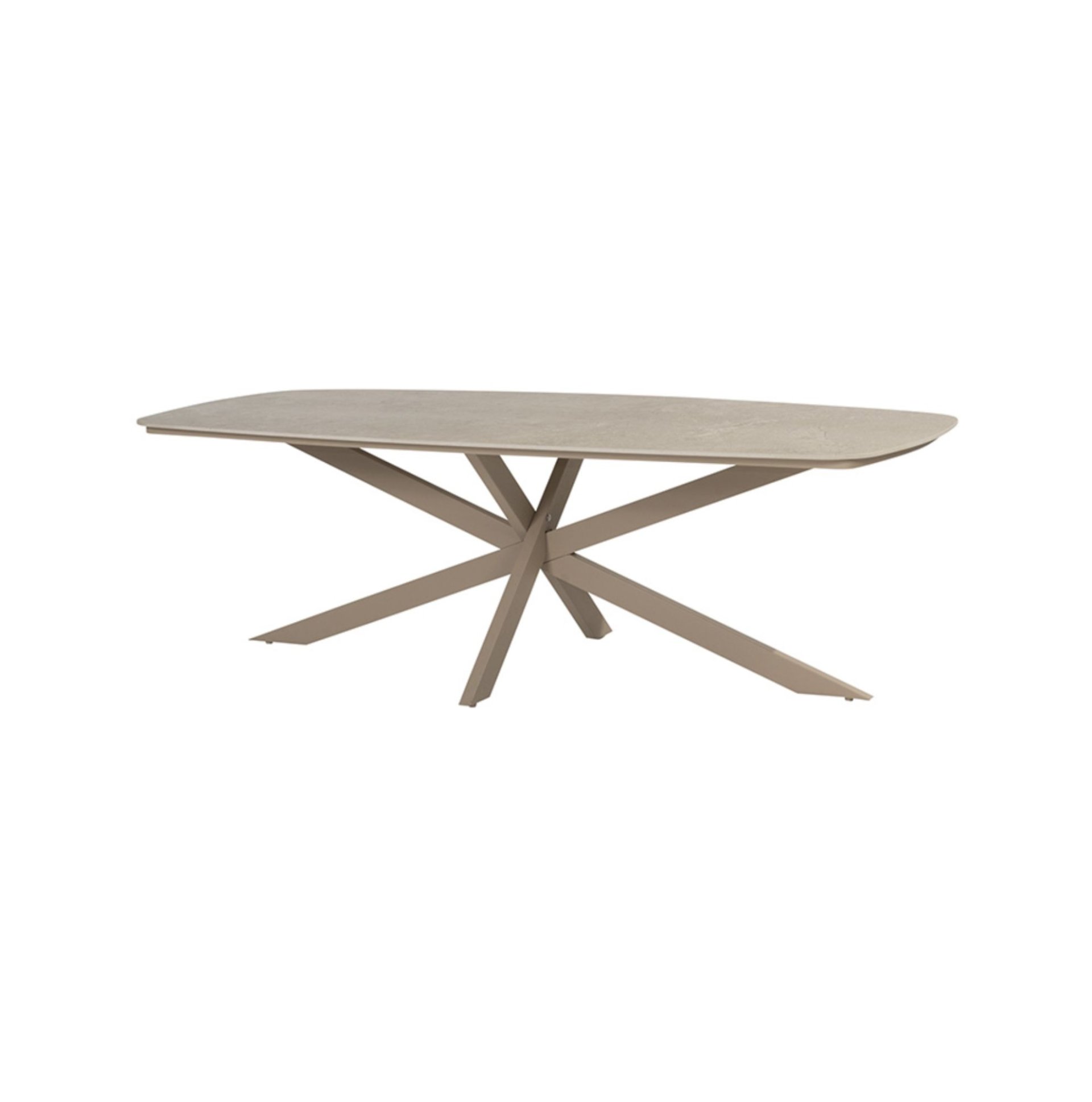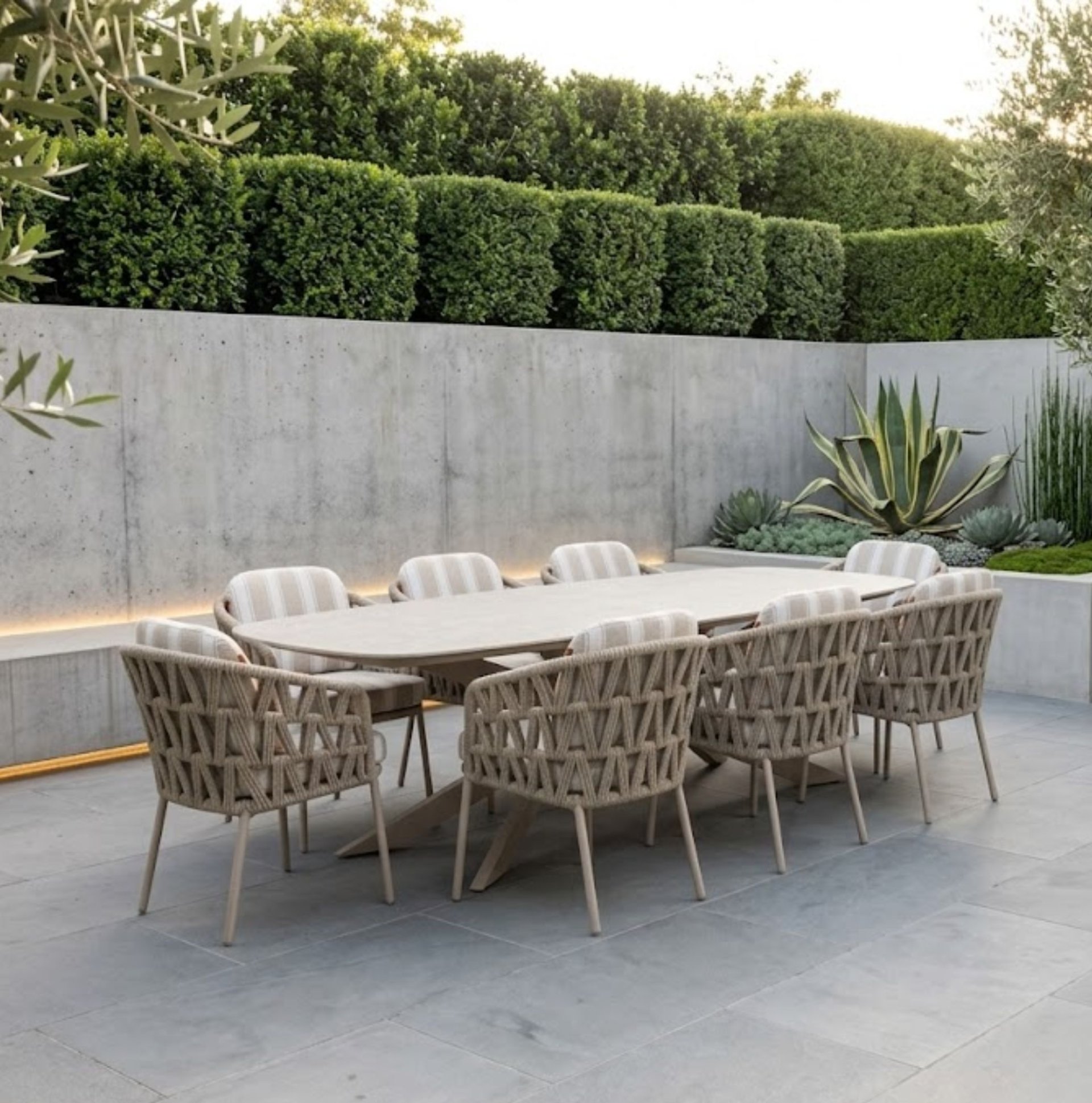 The Prado dining table paired with Puglia chairs showcases a Contemporary & Sophisticated design—blending modern style with a refined handcrafted look. The taupe-grey color palette creates a calm yet luxurious atmosphere, perfect for an elegant dining setting.