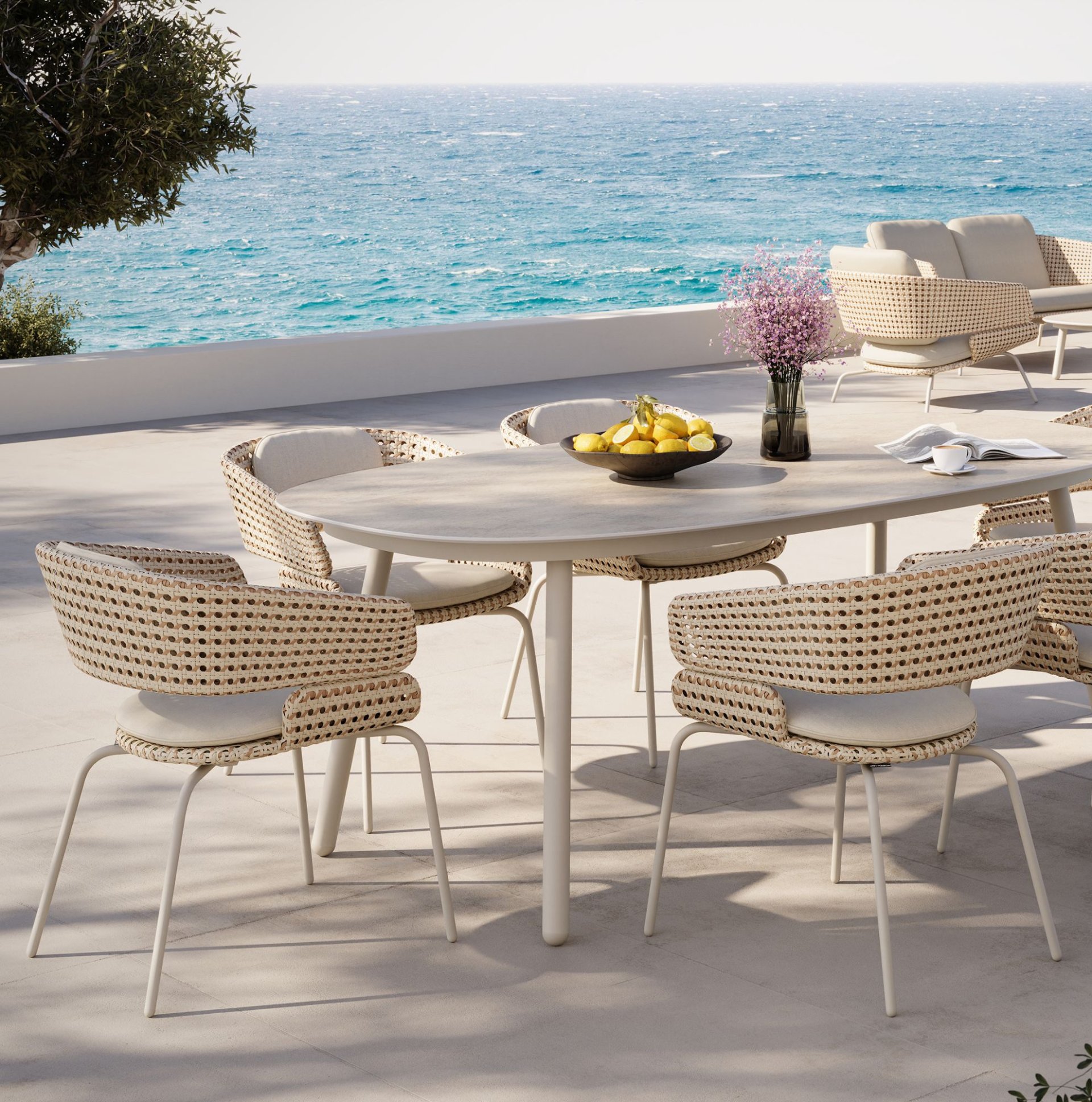 Materials : Aluminium frame, Ceramic, Stainless steel frame, Wicker, Sunbrella fabric