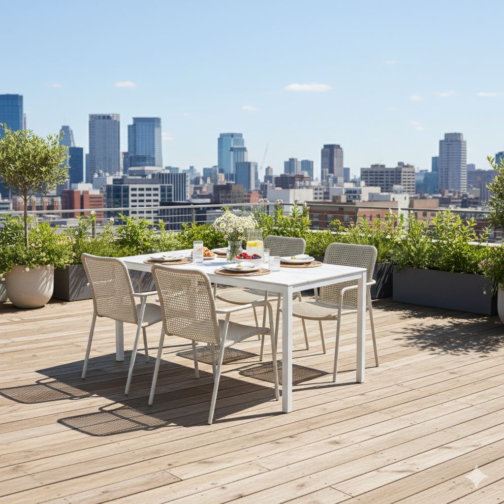 โต๊ะที่ออกแบบมาเพื่อให้ทุกมื้อกลางแจ้งดูดีแบบไม่ต้องพยายาม หน้าเซรามิกลายหิน สวยสะอาดตา ใช้ง่าย ไม่กลัวเปื้อน โครงอะลูมิเนียมแข็งแรง ทนแดดทนฝน อยู่ข้างนอกได้สบายใจ นั่งชิลล์ได้ทั้งครอบครัวหรือกลุ่มเพื่อน เหมาะกับสวน ระเบียง หรือมุมกินข้าวข้างนอกที่อยากให้ดูดีแบบธรรมชาติ
